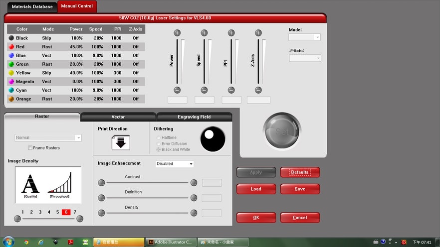 - 若在CMYK模式下,會造成顏色無法構成RGB為255或0的狀態,雷切機無法辨識。